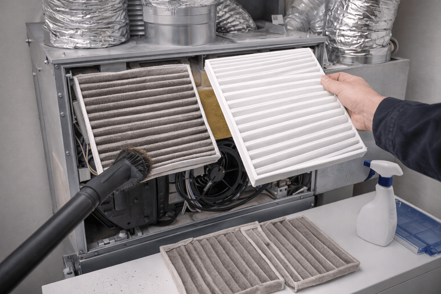Mellan filterbytena kan det vara bra att dammsuga filtren försiktigt, särskilt om du märker att de ser smutsiga ut men du inte har möjlighet att byta dem direkt. Detta bör dock bara ses som en tillfällig lösning – filtren blir inte lika effektiva efter rengöring, och det är inte alla filter som tål att bli rengjorda.
